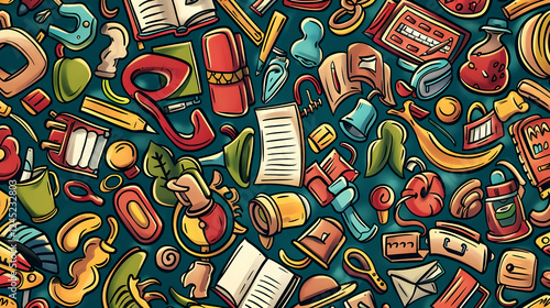 Colorful collage of various objects including books, tools, and stationery on a vibrant background