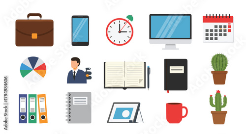 Colorful collection of flat design icons for business and office work, featuring a computer, calendar, briefcase, and more.