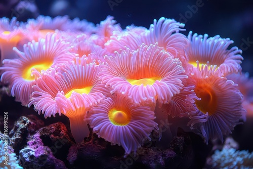 colorful coral reef teeming with a variety of fish and vivid corals illuminated by bright neon purple light capturing the mesmerizing beauty of underwater life
