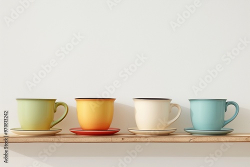 colorful cup of coffee or tea on wooden shelf with white wall