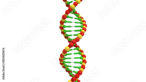 Colorful DNA molecule model isolated PNG, double helix structure with red and yellow spheres connected by green rods on transparent background