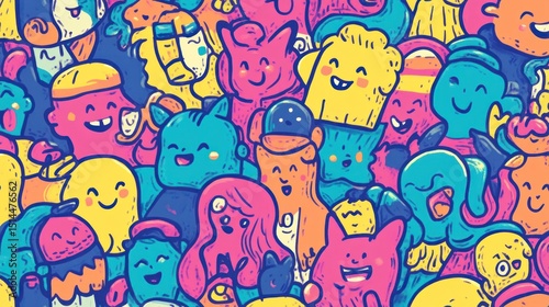 Colorful doodle characters crowd.
