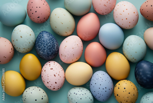 Colorful Easter eggs background. Easter eggs are painted in pastel colors with polka dots.
