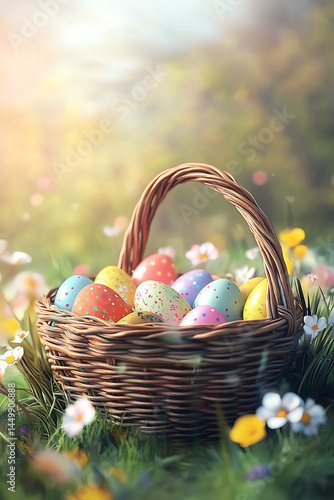 Colorful Easter eggs in a wicker basket surrounded by vibrant flowers in a sunny meadow