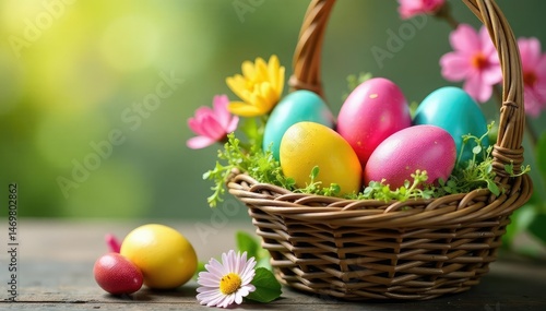 Colorful Easter eggs nestled in a basket with spring flowers, celebrating the religious holiday , springtime, Christian, colorful