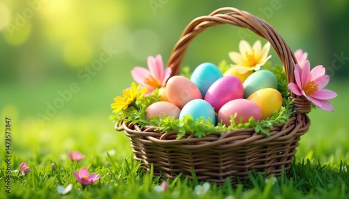 Colorful Easter eggs nestled in a spring basket overflowing with fresh flowers and green grass , element, garden
