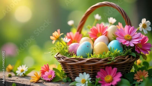 Colorful Easter eggs nestled in a spring basket overflowing with vibrant flowers , holiday decoration, easter decoration
