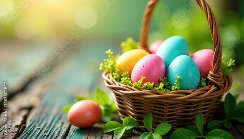 Colorful Easter eggs nestled in a spring basket, signifying the religious holiday , texture, springtime