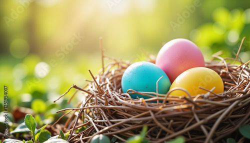 Colorful Easter eggs nestled in twigs, celebrating spring joy