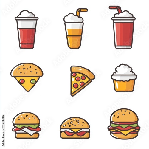 Colorful Fast Food and Drink Icons Featuring Burgers, Pizza, Soda, and Ice Cream for Your Fun and Delicious Culinary Designs