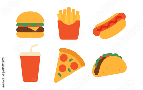 Colorful fast food icons set featuring burgers, pizza, and more