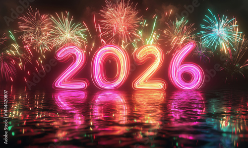 Colorful fireworks display celebrating New Year 2026 with vibrant glowing numbers.