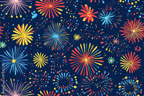 Colorful fireworks in night sky seamless pattern, bright on dark blue background. Flat style.