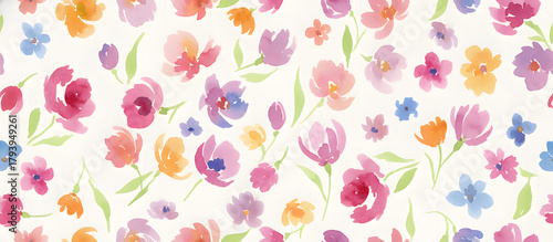Colorful floral pattern with pink, purple, orange, and blue flowers on a light background