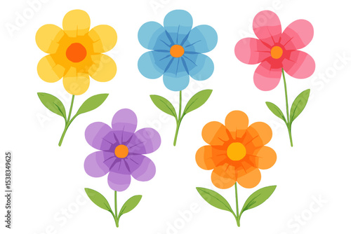 Colorful flowers set vector illustration. Cute simple cartoon floral elements with watercolor texture. Isolated spring summer flower collection for kids design, greeting card, sticker.