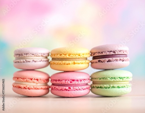 Colorful French macarons stacked in rows on a table, sweet meringue cookies with a soft filling, delightful pastry treats perfect for any occasion