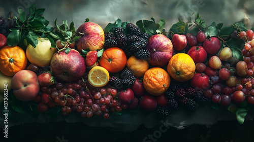 Colorful fresh fruits and vegetables arranged in an artistic pattern, celebrating nature's bounty and healthy living.