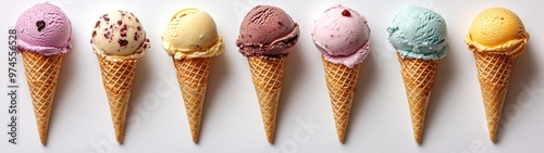 Colorful gelato scoops in cones, vibrant flavors showcased against a clean white background, inviting and visually appealing display of delicious frozen treats