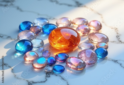 Colorful gemstones arranged in a circular pattern on a marble surface