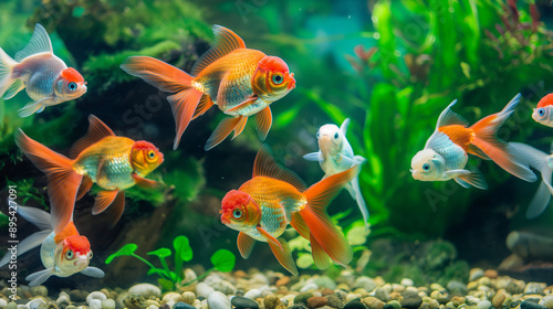 Colorful goldfish swimming in a lush, plant-filled aquarium.