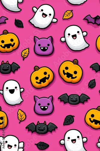 Colorful Halloween Pattern with Cute Ghosts and Pumpkins