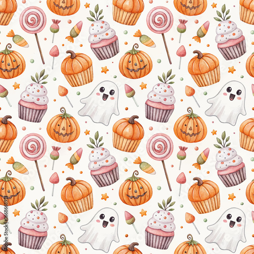 Colorful Halloween Pattern with Pumpkins, Ghosts, Cupcakes, and Candies for Festive Designs and Creative Projects