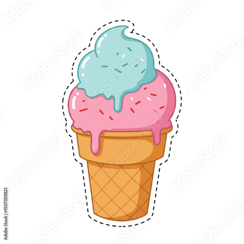 Colorful ice cream cone with pink and blue scoops on a white background