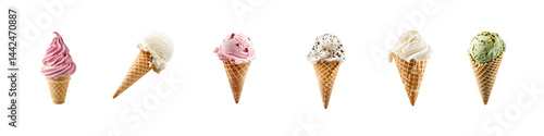 Colorful Ice Cream Cones Displayed in a Row on a White Background