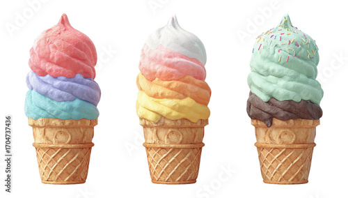 Colorful Ice Cream Cones with Swirled Toppings Isolated on Transparent Background
