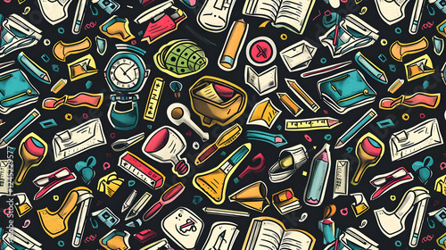 Colorful illustration of various school supplies and learning tools scattered on a dark background