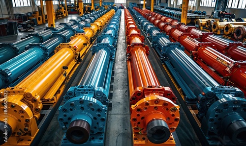 Colorful industrial equipment, including conveyor belts and hydraulic presses, fills the vast warehouse in an organized manner.