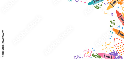 Colorful kindergarten crayon background with doodles drawn by colorful crayons. Childlike border frame with pencils and childish drawings on paper. Vector illustration for certificate, diploma, poster