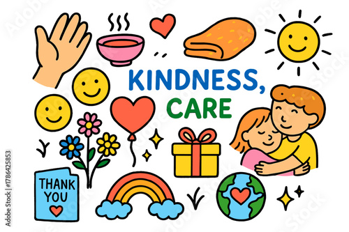 Colorful Kindness Icons. Kindness and care. Colorful Hand-drawn doodle Children illustration Kindness and care helping hands, smiley faces, heart balloon, soup