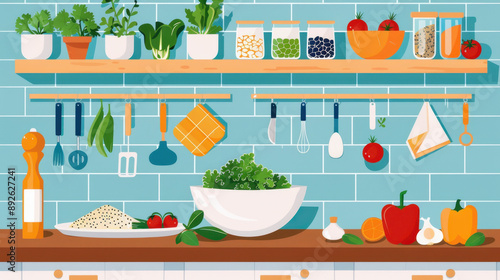 Colorful kitchen scene with fresh vegetables, herbs, and cooking utensils on shelves against a blue tiled background