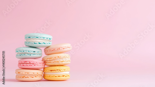 Colorful macarons stacked on pastel background create delightful and cheerful scene