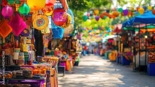 Colorful market street in a vibrant town showcasing artisan crafts and handmade goods during sunny daytime