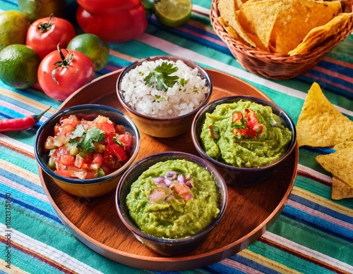 Colorful Mexican Salsa Bar Featuring Freshly Prepared Guacamole, Pico de Gallo, and Spicy Salsa Verde, Served With a Basket of Warm Tortilla Chips on a Vibrant Table