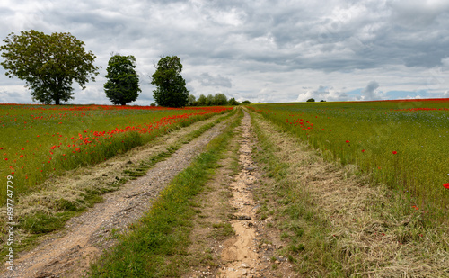 Colorful nature background, poppy and blue flax linen fields with many red poppy flowers, Charente, France in spring