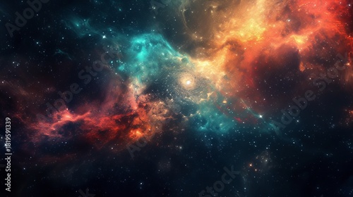 Colorful nebula and a spiral galaxy in deep space. Cosmic background with glowing stars and interstellar gas. Universe and astronomy wallpaper