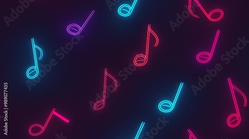 Colorful neon musical notes on a dark background, perfect for representing music, rhythm, or sound in creative projects.