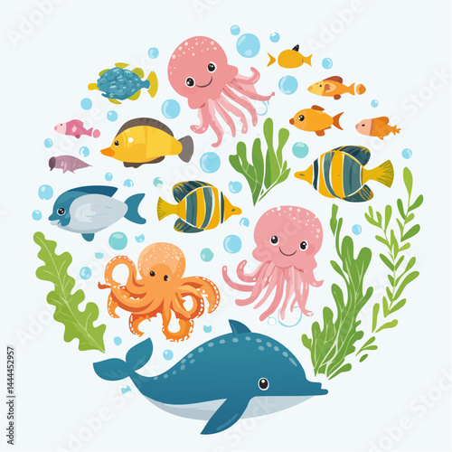 Colorful Ocean Life Illustration Featuring Various Sea Creatures