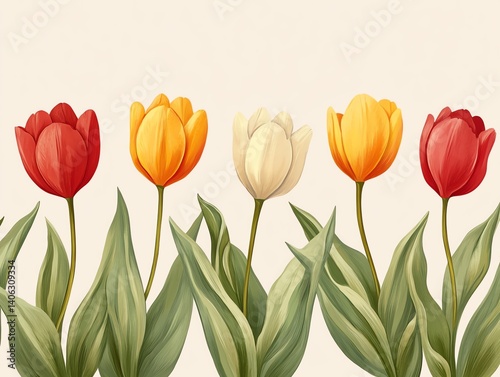 Colorful orange, red, and white tulips create a cheerful floral border perfect for spring designs and textile prints.