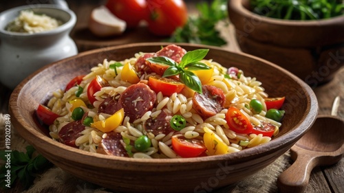 Colorful Orzo Pasta Salad with Salami, Bell Peppers, and Cherry Tomatoes in Rustic Bowl