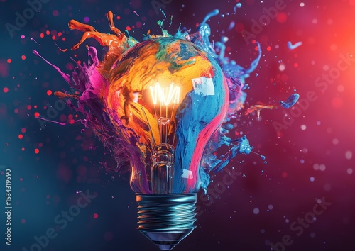 Colorful paint splashes surround a glowing lightbulb