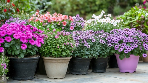 Colorful petunias in pots on terrace, closeup