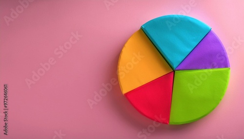 Colorful pie chart on a pink background. Bright sections, each a different color, arranged in a circular shape. Business, data visualization concept.