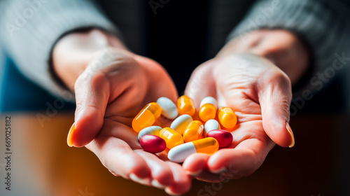 Colorful Pills and capsules held in hands by an elderly person. Concept of over-medicalization, cures and addictive drugs. Close up with shallow field of view and copyspace.
