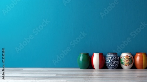 Colorful pottery jars against teal wall, global unity concept, website banner