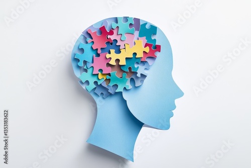 Colorful puzzle pieces forming a brain inside a head silhouette.