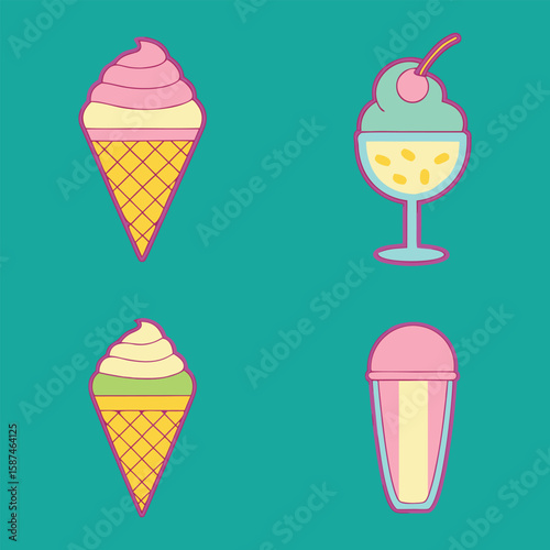 Colorful Retro Cartoon Illustration of Ice Cream Cones and Sundaes on Teal Background